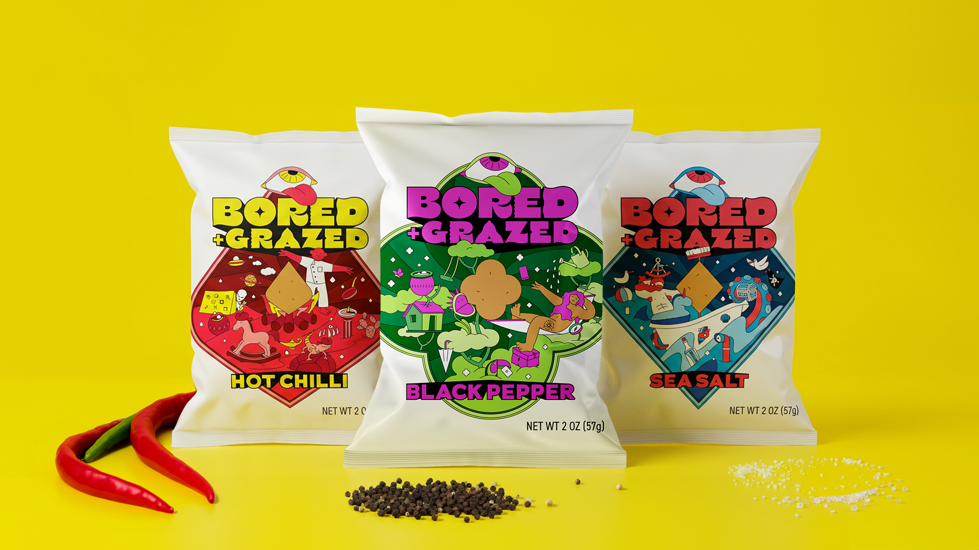 This conceptual packaging project was developed by Dearness Only Design Studio for a proposed product line. It explores a vibrant, illustrated packaging system for three healthy snacks under the concept Bored & Grazed. Each design represents a surreal escape from boredom, featuring bold visuals and distinct identities that reflect each snack’s core ingredient.